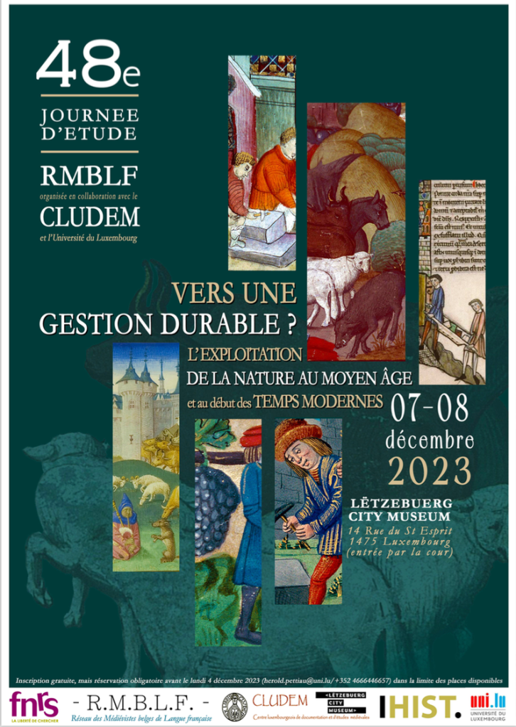Depuis le début du XXIe siècle, les médiévistes étudient à nouveaux frais le rapport des hommes et des femmes du Moyen Âge à leur environnement naturel. Inspirées par les enjeux climatiques d’aujourd’hui et de demain, remettant en question des concepts que l’on tenait depuis longtemps pour acquis – tel celui de « ressources naturelles » –, ces recherches de plus en plus interdisciplinaires prennent le relais de travaux pionniers menés dès les années 1960 en Belgique, dans une perspective qui était souvent celle de l’histoire économique. Près de vingt-cinq ans après une première journée d’étude consacrée au « milieu naturel et [à] l’homme médiéval », le RMBLF souhaiterait revenir sur la manière dont les médiévaux ont tiré parti de la nature pour produire, bâtir et consommer. Trois axes de recherche seront privilégiés lors de cette rencontre qui permettra d’interroger la pertinence de la notion de « développement durable » pour la période médiévale. Ce rendez-vous sera aussi l’occasion de renouer les liens entre les médiévistes belges et luxembourgeois, dans le cadre prestigieux du Musée d’Histoire de la Ville de Luxembourg (Lëtzebuerg City Museum).