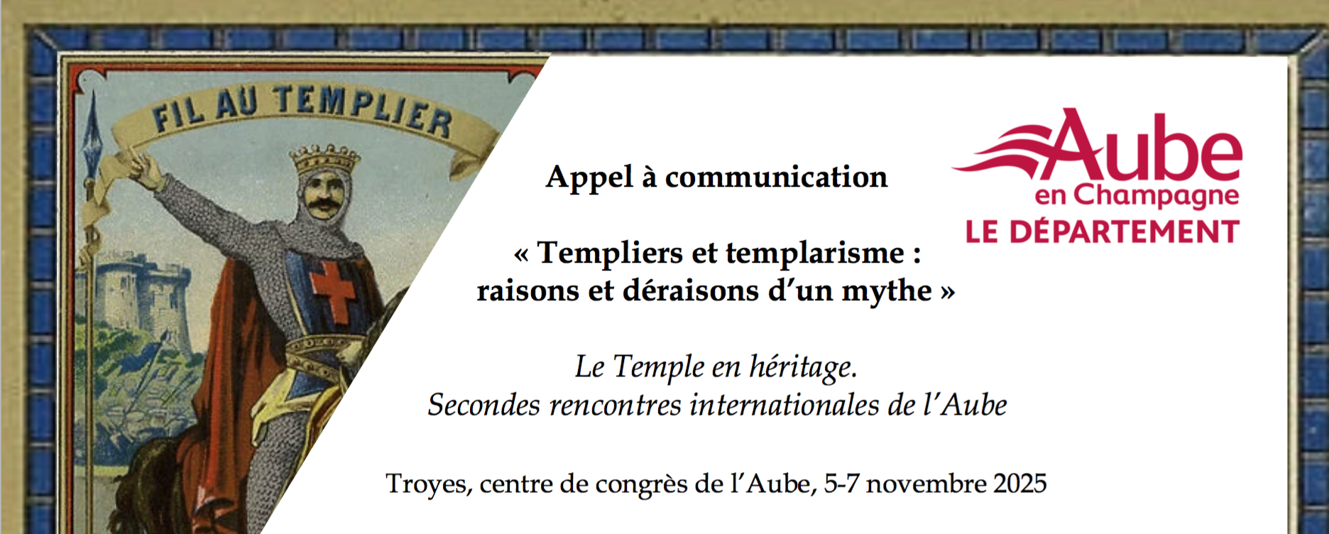 Ce sont ces usages pluriels, enchevêtrés, complexes par la diversité des formes et des acteurs qu’ils mobilisent, que nous nous proposons d’étudier lors d’un colloque transdisciplinaire organisé à Troyes du 5 au 7 novembre 2025 par la direction des Archives et du Patrimoine de l’Aube, dans le cadre de la programmation scientifique de la Fédération de la route templière européenne (www.templars-route.eu). L’enjeu de ces journées n’est pas de décortiquer les erreurs historiques qui sous-tendent ces mythes, mais plutôt de prendre ces derniers au sérieux afin d’étudier ce qu’ils disent de notre rapport au Moyen Âge et aux médiévalismes contemporains.