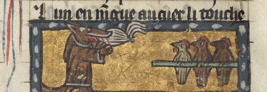 Mara Calloni a reçu sa formation de romaniste à l’université de Milan. En 2019 elle a soutenu à l’université de Macerata une thèse de doctorat sur la branche XI du Roman de Renart, dont elle a publié l’étude et la traduction en italien dans le volume Le metamorfosi della volpe (2021). Actuellement elle est titulaire d’une bourse de recherche post-doctorale de l’Opera del Vocabolario Italiano (OVI – CNR). Ses recherches portent notamment sur la tradition manuscrite renardienne et la matière des bestiaires et des encyclopédies médiévaux.- Légende de l’illustration : Renart devenu moine dévore les chapons offerts à son abbaye. Roman de Renart, France du nord, 1re moitié du XIVe s. Paris, BnF, fr. 12584, f. 76v.