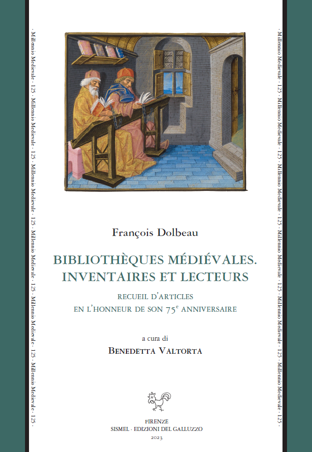 François Dolbeau, Bibliothèques médiévales: inventaires et lecteurs. Recueil d’articles en l’honneur de son 75e anniversaire, dir. Benedetta Valtorta, Rome, SISMEL – Edizioni del Galluzzo, 2023 ; 1 vol., XVII–440 p. (Millenio Medievale, 125 ; Strumenti et Studi, 48). ISBN : 978-88-9290-250-3. Prix : € 88,00.