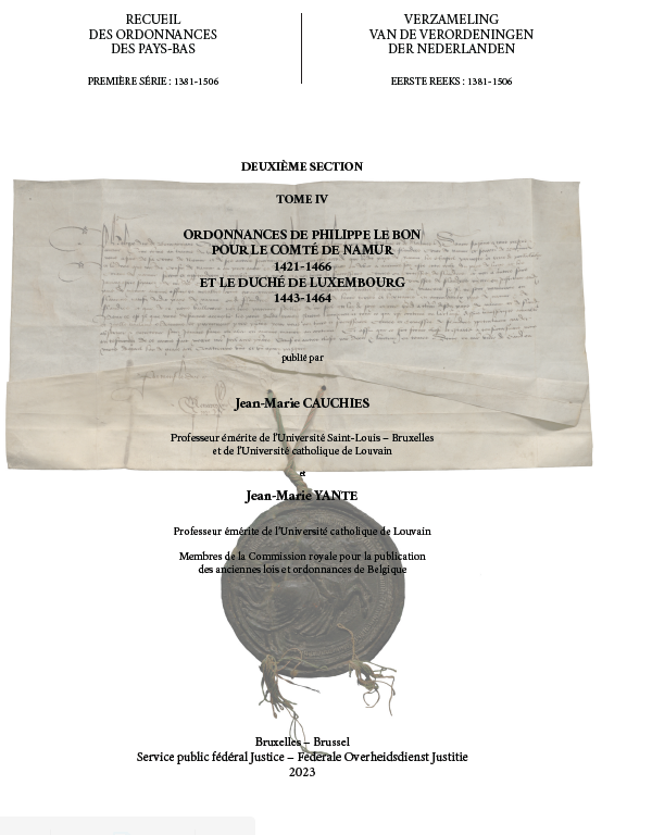 Ordonnances de Philippe le Bon pour le Comté de Namur 1421-1466 et le Duché de Luxembourg 1443-1464, éd. Jean-Marie Cauchies, Jean-Marie Yante, Bruxelles, Commission royale pour la publication des anciennes lois et ordonnances, 2023 ; 1 vol., 208 p. (Recueil des Ordonnances des Pays-Bas, 1re série, 1381-1506).