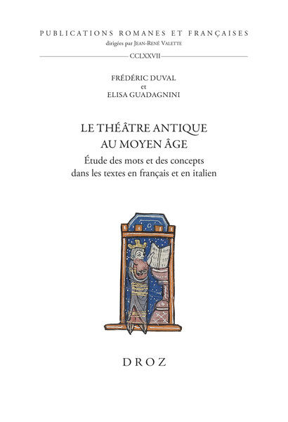 Frédéric Duval, Elisa Guadagnini, Le théâtre antique au Moyen Âge Étude des mots et des concepts dans les textes en français et en italien, Genève, Droz, 2024 ; 1 vol., 672 p. (Publications Romanes et Françaises, 277). ISBN : 978-2-600-06468-2. Prix : CHF 75,00.