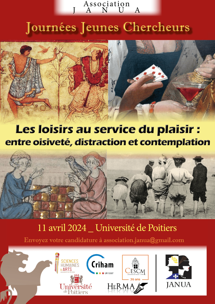 Chaque année, l’association des jeunes chercheuses et chercheurs inscrits en Master et en Doctorat en Sciences Humaines et Arts à l’Université de Poitiers (JANUA), organise une journée d’études. Cette journée interdisciplinaire, ayant à vocation de valoriser les travaux de jeunes chercheurs (étudiants de Master 2, doctorants et post-doctorants), portera cette année sur la thématique des loisirs.