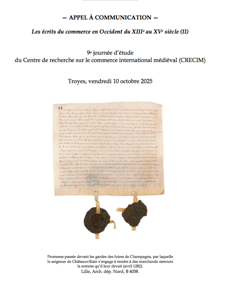 Le 13 octobre 2023 se tenait à Troyes la 7e journée d’étude du CRECIM sur le thème Les écrits du commerce en Occident du XIIIe au XVe siècle. Des interventions présentèrent et mirent en œuvre divers types de sources (archives notariales roussillonnaises, archives des cours et guildes marchandes catalanes et italiennes, archives Datini à Prato, comptabilités Salviati de Londres et de Bruges). D’autres exposés furent consacrés aux foires de Champagne, abordées tant sous l’angle de leur création et de leur organisation, que de leur héritage documentaire et de leur évocation dans les sources littéraires.