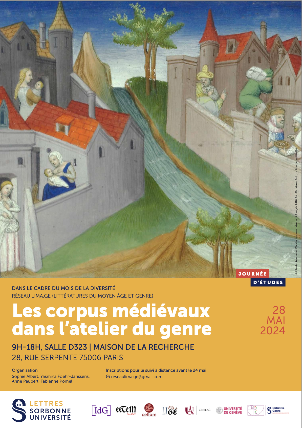 Cette journée d’études, organisée par le réseau LIMA.GE (Littératures du Moyen Age et Genre), s’intègre à un programme en deux volets dont le premier s’est tenu à l’Université Rennes 2 du 13 au 15 mars, sous la forme d’un colloque intitulé « Les littératures médiévales dans l’atelier du genre ». L’ensemble du programme a pour ambition, d’une part, de cerner ce qui fait la singularité et la fécondité d’une approche littéraire des textes médiévaux par le champ conceptuel du genre ; d’autre part, de dessiner une cartographie de notions susceptibles d’éclairer les textes médiévaux ; enfin, de proposer des démarches interprétatives qui puissent faire office sinon de modèles, du moins d’exemples propres à nourrir et à inspirer des recherches et des enseignements futur·es. Les interventions de la journée, appuyées sur des études de cas, se concentreront sur l’explicitation d’une méthodologie incluant le genre. Elles interrogeront, entre autres, l’usage des notions de performativité ou d’intersectionnalité, mais aussi les angles morts de l’histoire littéraire, afin de mettre en lumière les gains herméneutiques qui résultent de cette démarche.