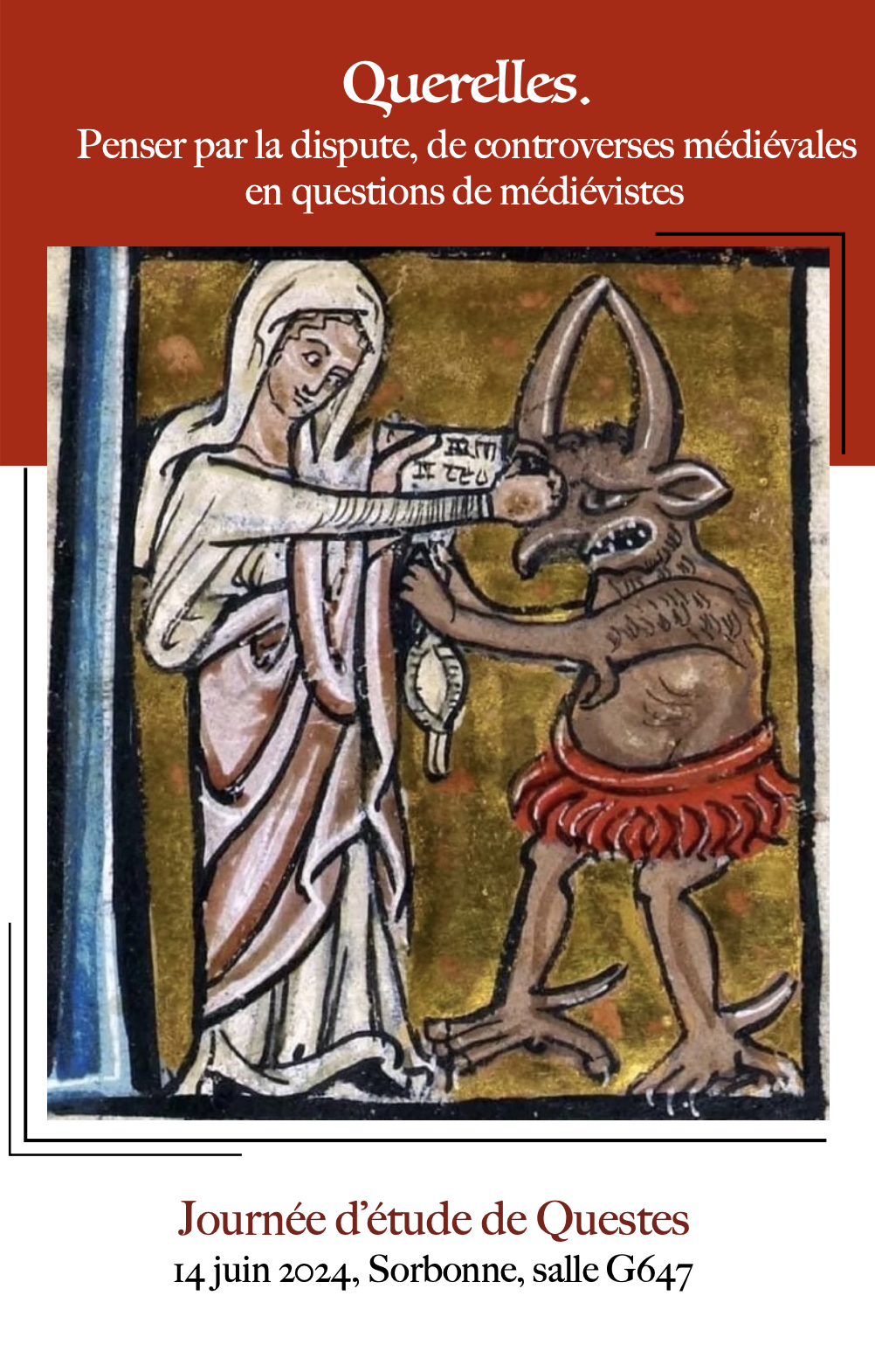 Séances hybrides, en présentiel (dans la limite des places disponibles) et en distanciel. Pour obtenir le lien de connexion ou pour venir assister à la journée si vous êtes extérieur à Sorbonne Université, nous écrire à jequerellesquestes@gmail.com.