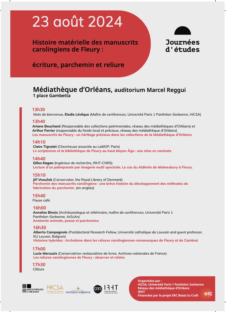 - 17h – Lucie Moruzzis (Conservatrice-restauratrice de livres, Archives nationales de France), Les reliures carolingiennes de Fleury : observer et refaire