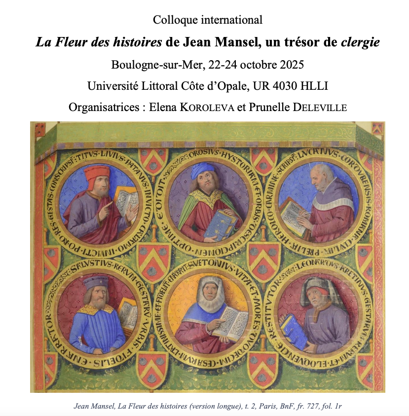 Demeurée inédite jusqu’à présent, La Fleur des histoires (version en trois livres) fait actuellement l’objet d’une édition critique menée par une équipe internationale composée de onze chercheur.ses (https://fleur.hypotheses.org/equipe). En lien avec ce travail d’édition, nous souhaitons organiser un premier colloque international consacré à cette œuvre, encore largement méconnue et peu étudiée. Le colloque se tiendra à Boulogne-sur-Mer du 22 au 24 octobre 2025 et réunira des spécialistes de plusieurs disciplines (langue et littérature médiévales, histoire, histoire de l’art).