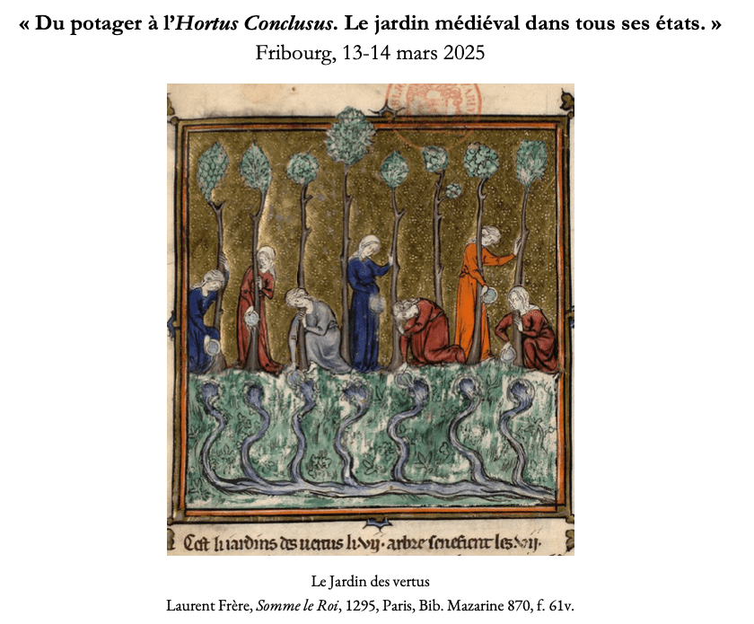 Les traditionnelles Journées d’études organisées par les Jeunes Chercheur·euses Médiévistes (JCM) se tiendront cette année les 13 et 14 mars 2025 à l’Université de Fribourg. Selon une perspective interdisciplinaire, elles seront consacrées au thème du jardin médiéval. Qu’ils soient alimentaires ou d’agrément, courtois ou philosophiques, d’amour ou de médecine, qu’ils soient Hortus Conclusus ou Deliciarum, les jardins médiévaux constituent un monde à défricher et à cultiver sous tous leurs aspects.