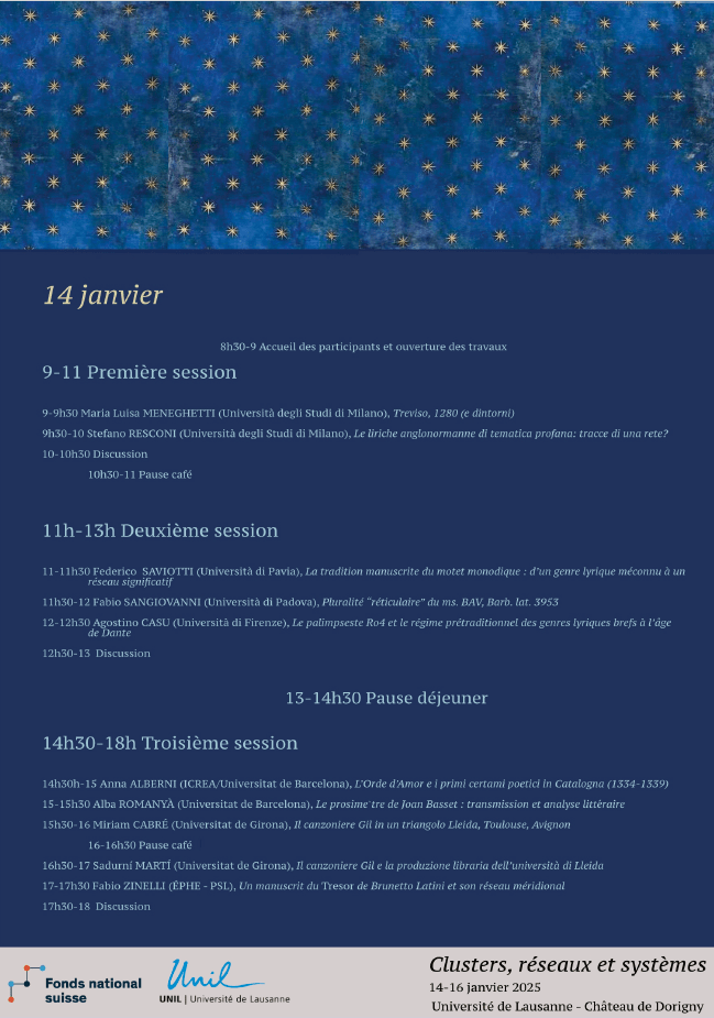 En occasion de la clôture du projet FNS Répertoire critique des manuscrits li4éraires en ancien occitan, nous voudrions solliciter les collègues travaillant sur les littératures romanes et plus en général sur l’écrit roman d’époque médiévale à réfléchir autour des notions de cluster, de réseau et de système, et sur leurs possibles applications aux traditions manuscrites du Moyen Âge vernaculaire. À la fois à travers des communications d’orientation théorique et grâce à des cas d’étude ponctuels, nous espérons réfléchir à comment une enquête élargie, et potentiellement interdisciplinaire, sur les manuscrits peut permettre de remonter aux contextes de production libraire et ensuite éclaircir comment ceux-ci ont conditionné l’établissement et la transmission de pratiques linguistiques, de modes littéraires, et surtout impacté sur la dissémination des textes.