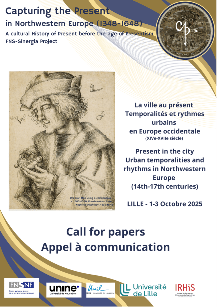 At least, that’s the idea behind this meeting, part of the SNSF-Sinergia project “Capturing the Present in Northwestern Europe (1348-1648)”. The aim is to capture not only the measurement of present time, but also the feeling of its passing,which so troubled the mind of Saint Augustine and all those who strove to define it. The question of subjectively experienced time may seem trivial. But placing it in a particular context, determined by as many parameters as places, social status, ages, activities, individual or collective ambitions, political or economic imperatives, etc., gives it all its richness and fulfils the wishes of Marc Bloch, for whom history must approach “the human moment when these currents tighten in the powerful node of consciences” (Bloch, 1949). In the comparison offered by a vast Western urban Europe, which will support studies more specifically dedicated to its northern part, in order to grasp its specificities, the aim of this meeting is to observe city dwellers caught up in the game of multiple temporalities that cross them and feed their sense of belonging or exclusion to different social groups.