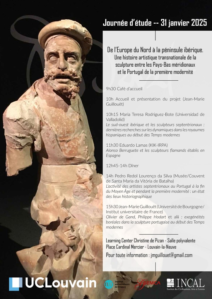La sculpture portugaise de la fin du Moyen Âge et de la première modernité offre un terrain d’observation particulièrement favorable pour comprendre les mécaniques comme les chronologies des transferts culturels qui forgèrent le panorama artistique européen. Dans une perspective transnationale et non mediterrannéo-centrée, nous ambitionnons de réécrire les récits de l’histoire de l’art en prenant acte pour la première fois du rôle central et structurant des nombreux acteurs septentrionaux (hennuyers, picards, flamands, brabançons, normands…) au Portugal comme à Madère. Il s’agit pour cette journée d’étude de repenser à nouveaux frais les récits de la discipline en engageant d’abord un dialogue historiographique prolongeant les premières réflexions engagées il y a plusieurs décennies par Marcel Aubert en France ou Ignace Vandevivere en Belgique.