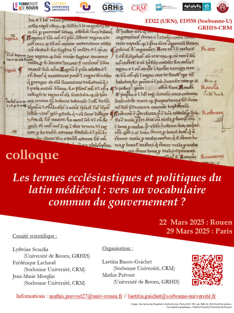 Ces Journées d’Études des 22 et 29 mars 2025 entendent ainsi s’intéresser aux évolutions et aux formes du réemploi du vocabulaire politique dans des traités à caractère religieux, tout au long du Moyen Âge, mais également aux échanges de vocables entre différents espaces, et différentes institutions, et par conséquent à leurs dynamiques de circulation dans l’espace européen, du IXe au XIVe siècle. La question des évolutions dans la compréhension de ces termes, tout au long de cette période, sera également posée.