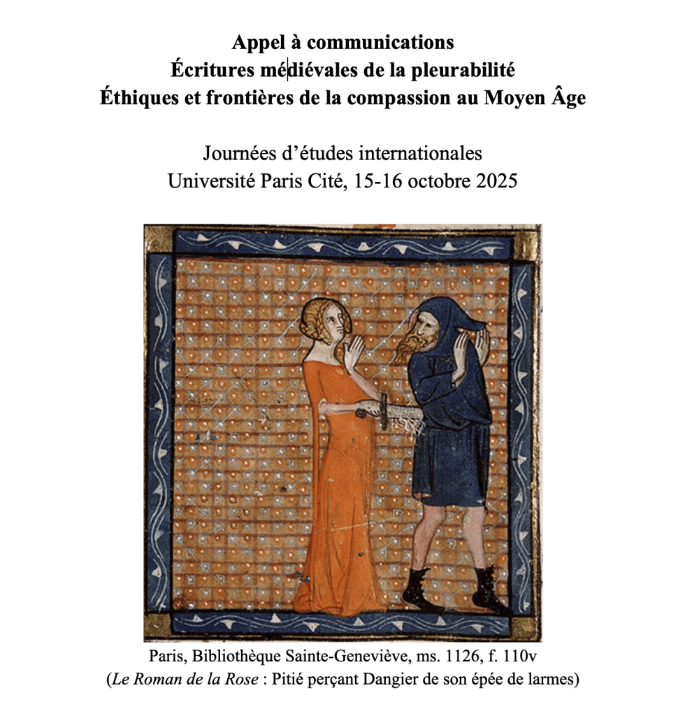 Fortes de ce constat, ces journées d’études se proposent d’analyser la façon dont les écrits et les représentations médiévales formulent et théorisent, mais aussi interrogent voire déplacent les conditions sociales et littéraires, politiques et poétiques, qui favorisent ou au contraire interdisent l’éveil et l’expression de la compassion à l’égard des individus ou de groupes qui pourraient être définis comme “à la marge” de la norme sociétale. Au-delà de cet examen d’une possible redéfinition des frontières du pleurable au Moyen Âge selon les contexte, ces rencontres seront l’occasion de réfléchir aux mécanismes éthiques et esthétiques ainsi qu’aux dispositifs d’écriture qui permettent la reconnaissance de certaines souffrances, ou au contraire favorisent la minimisation ou l’invisibilisation de certaines peines.