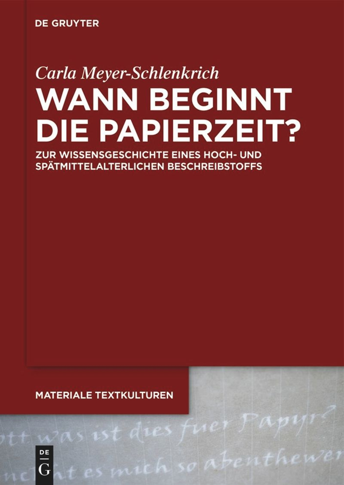 Carla Meyer-Schlenkrich, Wann beginnt die Papierzeit? Zur Wissensgeschichte eines hoch- und spätmittelalterlichen Beschreibstoffs, Berlin–Boston, De Gruyter, 2025 ; 1 vol., IX–704 p. (Materiale Textkulturen, 74). ISBN : 978-3-11129-474-2. Prix : € 129,25.