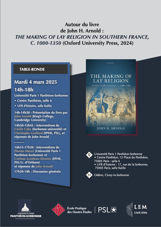 16h15-17h30 : Interventions de Florian Mazel (Université Paris 1 Panthéon-Sorbonne) et Corinne Leveleux-Teixeira (EPHE, PSL/U. d’Orléans), et réponses de John Arnold
