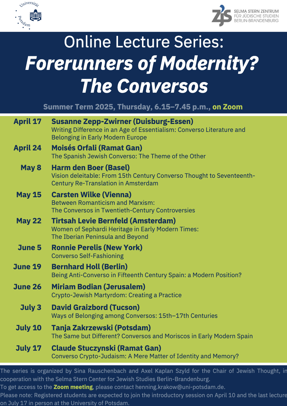 This lecture series touches upon some of these discussions and the background needed to understand fully the conversos’ impact and importance. Internationally renowned researchers feature prominently in this series, as they share their respective insights, questions, and scholarly critiques with students, fellow scholars, and the wider public.