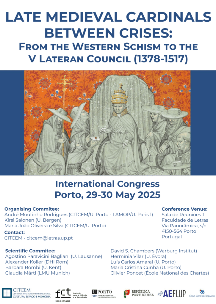 The history of the cardinalate, which stretches from the 11th century to the present day, went through one of the most volatile phases of its development between the beginning of the Western Schism (1378) and the close of the Fifth Lateran Council (1517). This congress aims to work and reflect on these cardinals, both as a group, gathered in the Sacred College, and in their individual dimensions, as lords, members of lineages, pastors, reformers, conciliarists, centres of courts, families and networks, diplomats and representatives of nations, patrons of the arts, among others. The cross-sectional interest of this congress stems from the desire to feed the historiographical renewal that has been taking place over the last two decades on the medieval cardinalate, seeking to bring together researchers who are dedicated to its study, regardless of the angle of approach they may take.
