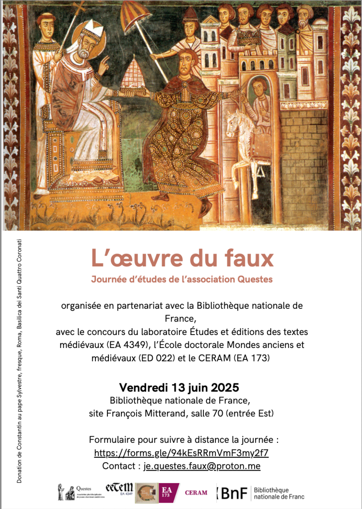 Cette journée interrogera le faux comme un dispositif central dans les sociétés médiévales, en considérant sa fonction stratégique à l’intersection des relations de pouvoir et des relations de savoir. Matérialité, pragmatique et axiologie du faux sont les trois axes autour desquels s’articuleront les communications, dans une perspective ouverte sur l’ensemble des sciences humaines.