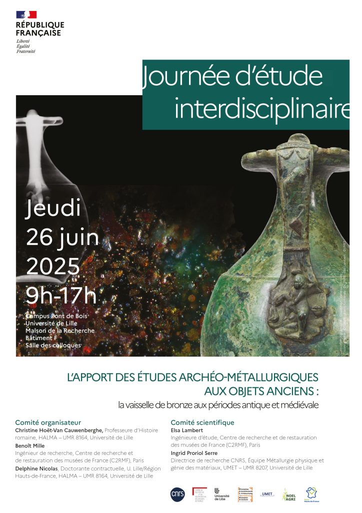 L’HALMA UMR 8164 ULille et le Centre de Recherche et de restauration des musée de France (C2RMF) proposent le jeudi 26 juin 2025 une journée d’étude interdisciplinaire sur l’apport des études archéo-métallurgiques aux objets anciens : la vaisselle de bronze aux périodes antique et médiévale.