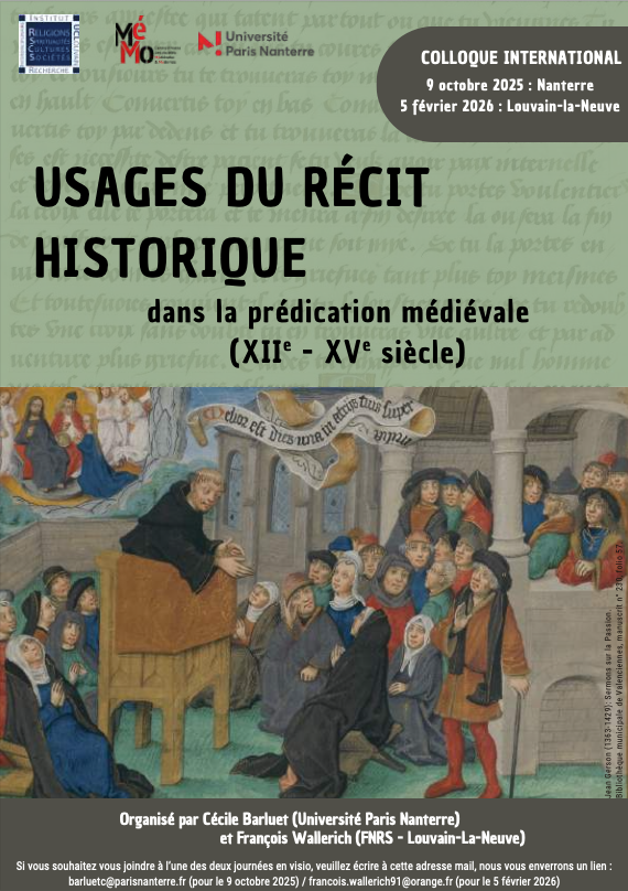 L’objectif de cette rencontre est donc d’interroger les usages de ces récits historiques au cours du second Moyen Âge, leur construction et leur interprétation en fonction des objectifs poursuivis. À travers l’analyse des instruments de travail des prédicateurs — recueils d’exempla, artes praedicandi, ouvrages historiques —ainsi que de la formation reçue dans les studia, écoles ou universités, on cherchera à cerner comment cette culture historique fut mise au service de l’encadrement des fidèles.