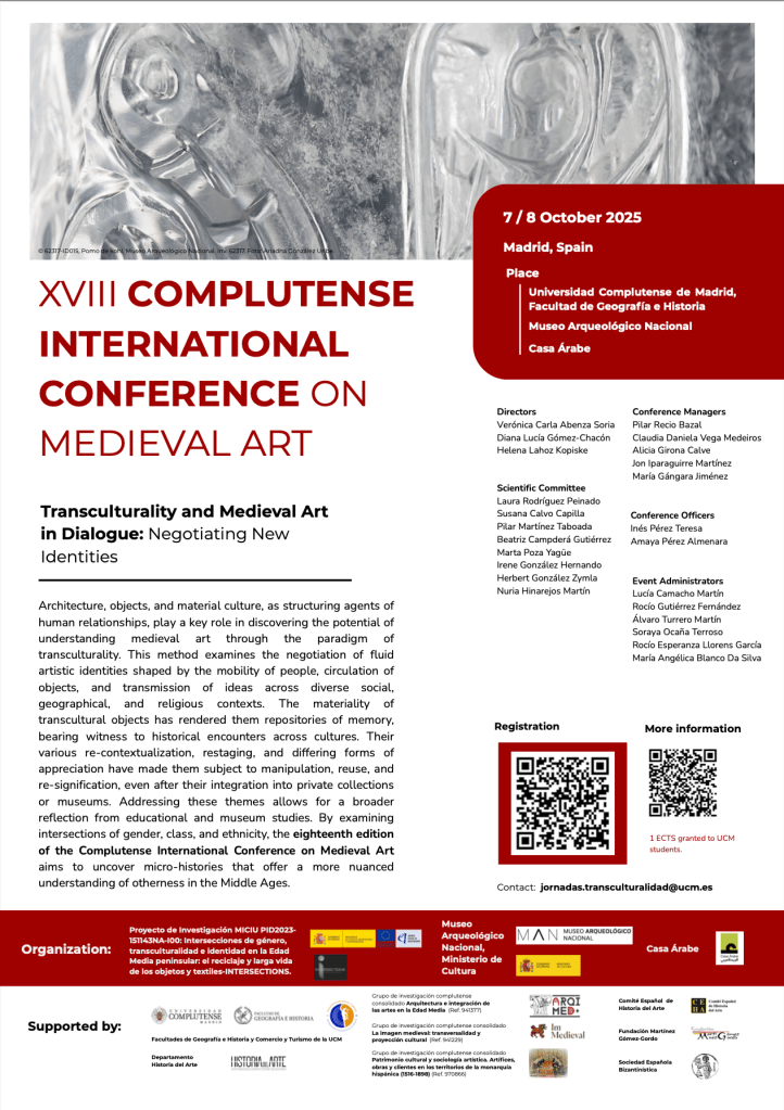 Architecture, objects, and material culture, as structuring agents of human relationships, play a key role in discovering the potential of understanding medieval art through the paradigm of transculturality. This method examines the negotiation of fluid artistic identities shaped by the mobility of people, circulation of objects, and transmission of ideas across diverse social, geographical, and religious contexts. The materiality of transcultural objects has rendered them repositories of memory, bearing witness to historical encounters across cultures. Their various recontextualization, restaging, and differing forms of appreciation have made them subject to manipulation, reuse, and re-signification, even after their integration into private collections or museums. Addressing these themes allows for a broader reflection from educational and museum studies. By examining intersections of gender, class, and ethnicity, the eighteenth edition of the Complutense International Conference on Medieval Art aims to uncover microhistories that offer a more nuanced understanding of otherness in the Middle Ages. Call for Papers Transculturality and Medieval Art in Dialogue: Negotiating New Identities