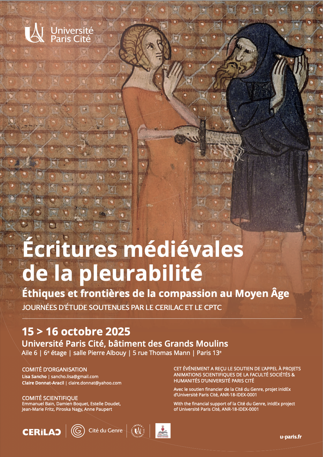 Fortes de ce constat, ces journées d’études se proposent d’analyser la façon dont les écrits et les représentations médiévales formulent et théorisent, mais aussi interrogent voire déplacent les conditions sociales et littéraires, politiques et poétiques, qui favorisent ou au contraire interdisent l’éveil et l’expression de la compassion à l’égard des individus ou de groupes qui pourraient être définis comme “à la marge” de la norme sociétale. Au-delà de cet examen d’une possible redéfinition des frontières du pleurable au Moyen Âge selon les contexte, ces rencontres seront l’occasion de réfléchir aux mécanismes éthiques et esthétiques ainsi qu’aux dispositifs d’écriture qui permettent la reconnaissance de certaines souffrances, ou au contraire favorisent la minimisation ou l’invisibilisation de certaines peines.