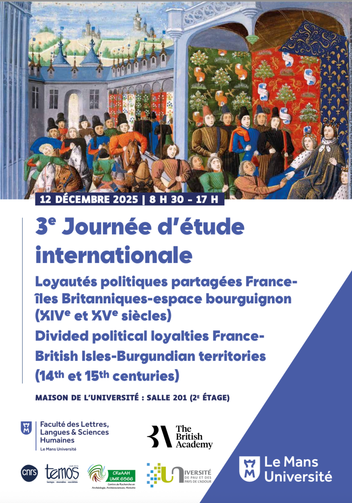La troisième Journée d’étude internationale sur les loyautés politiques partagées aux XIVe et XVe siècles, qui se tiendra sous forme hybride au Mans le 12 décembre 2025, prend la suite de deux Journées d’étude qui ont eu lieu en septembre 2023 et 2024 à Pau, sous la direction de Pierre Courroux.