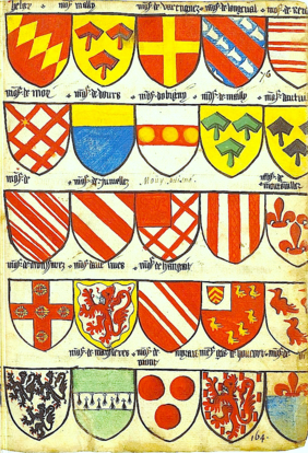 Apparues au XIIe siècle, les armoiries se composent de figures et de couleurs. Ces dernières, au nombre de six, se répartissent en deux groupes : dans le premier prennent place le blanc et le jaune ; dans le second, le rouge, le bleu, le noir et le vert. Pour composer des armoiries, une règle stricte interdit de juxtaposer ou de superposer deux couleurs qui appartiennent au même groupe. Au Moyen Âge cette règle, qui existe dès les débuts de l’héraldique, supporte fort peu d’exceptions.