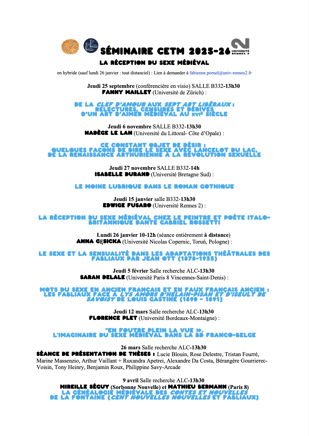 En hybride (sauf lundi 26 janvier : tout distanciel) : Lien à demander à fabienne.pomel@univ-rennes2.fr