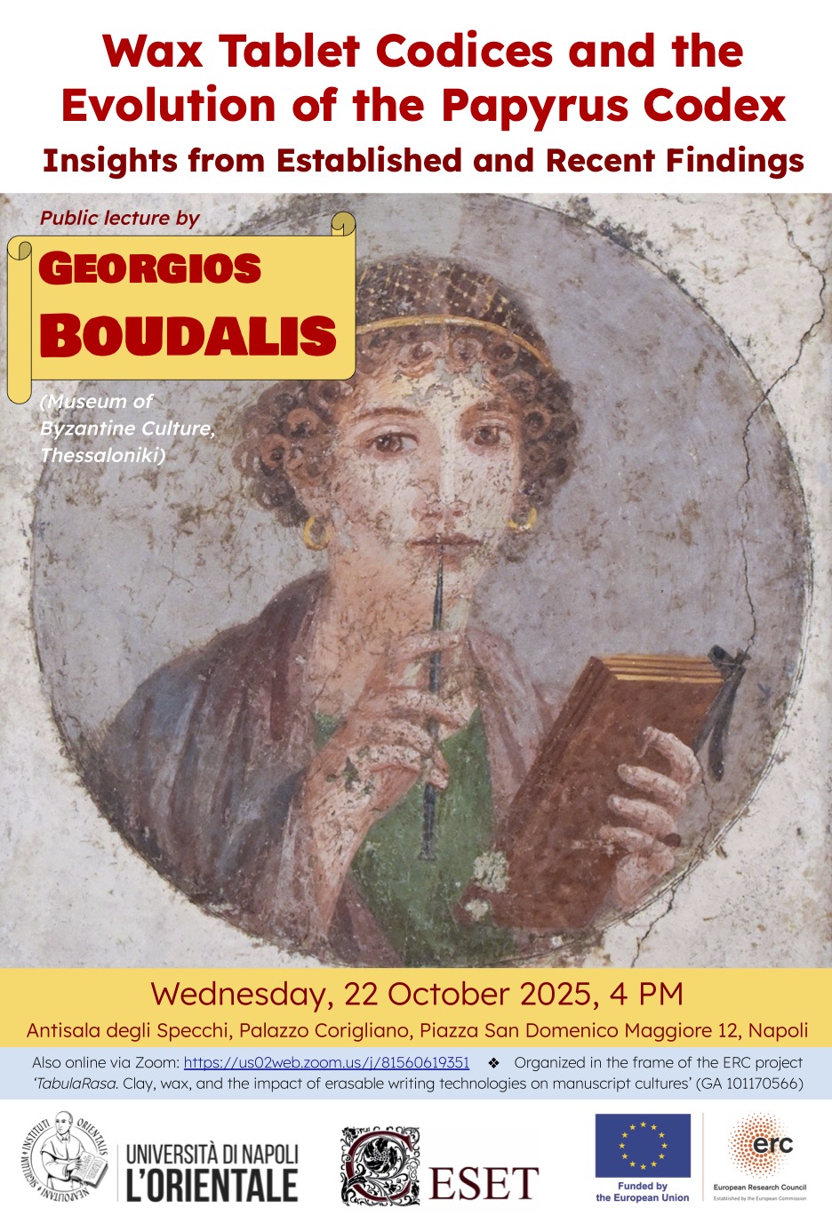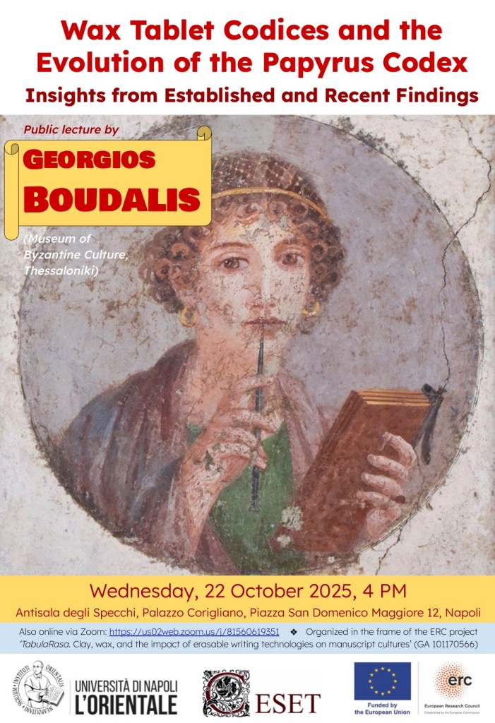 Dr Georgios Boudalis, Senior Book Conservator at the Museum of Byzantine Culture in Thessaloniki (Greece), will give a hybrid public lecture on “Wax Tablet Codices and the Evolution of the Papyrus Codex: Insights from Established and Recent Findings” at the University of Naples “L’Orientale” on Wednesday, 22 October 2025, at 4 PM CET.