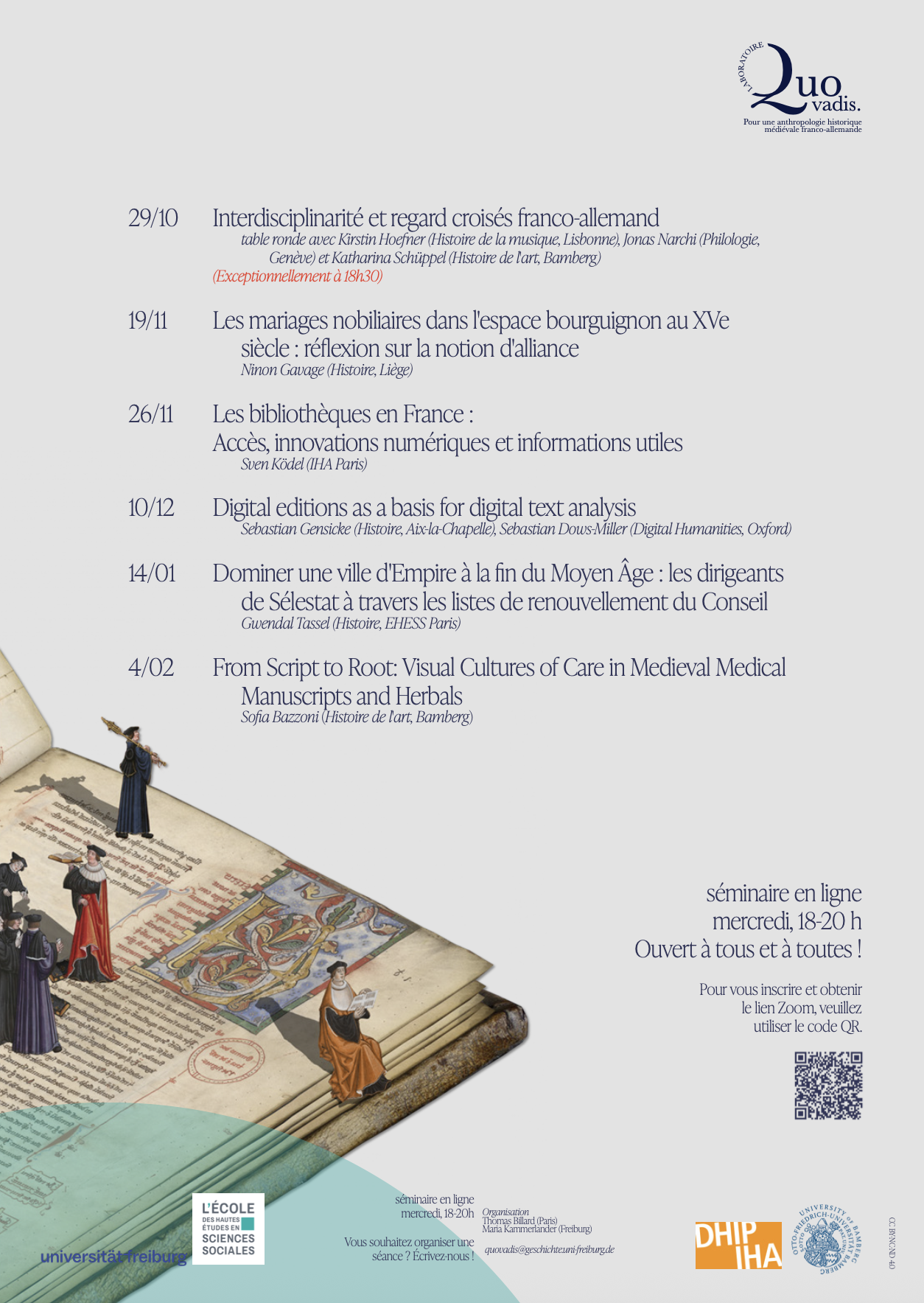 Le séminaire aborde des questions de médiévistique francophone et germanophone. Il a pour vocation première de mettre en relation de jeunes chercheuses et chercheurs en master ou en doctorat de France, d’Allemagne, de Belgique, du Luxembourg, de Suisse et d’Autriche. Dans cet espace de travail bilingue en ligne, des projets de recherche actuels de médiévistique seront présentés et discutés, offrant ainsi de nouvelles perspectives de recherche en constante réinvention. La compréhension mutuelle entre les participants est sans conteste un enjeu central, dans la mesure où les systèmes de connaissance ainsi que les récits sont empreints de la langue dans laquelle ils sont formulés, mais aussi de l’évolution respective des structures académiques nationales. L’objectif est évidemment de tirer parti des différences identifiées lors des différentes séances, tant d’un point de vue méthodologique que théorique et conceptuel, au moyen de la discussion.
