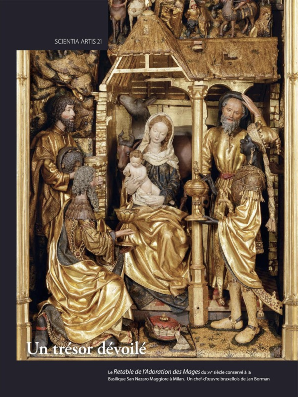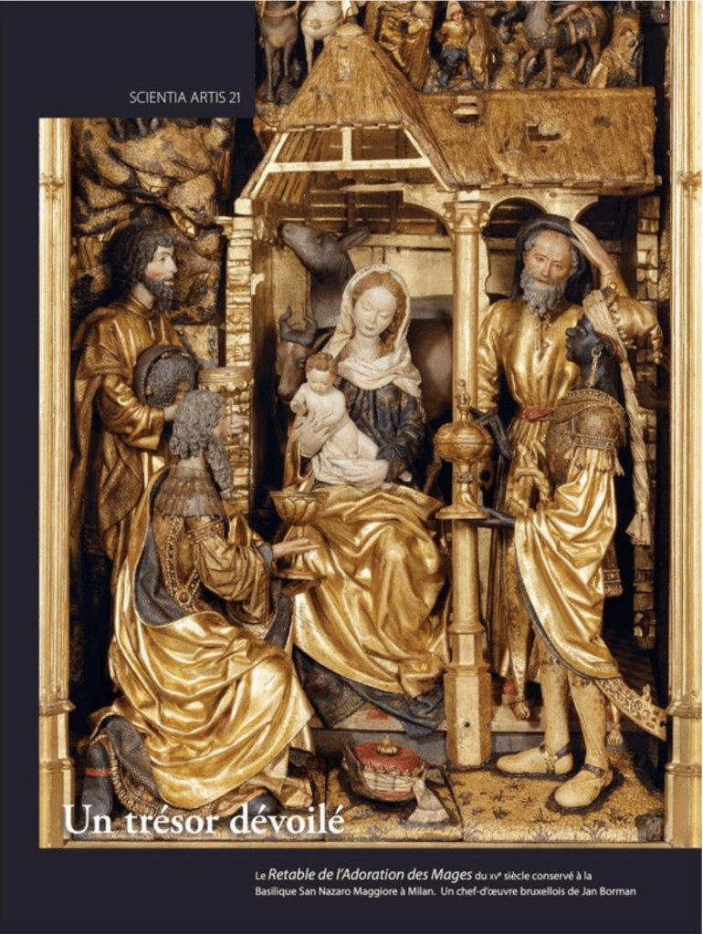 Découvert dans une église de Milan, un retable se révèle être un chef-d’œuvre de la sculpture bruxelloise de la fin du xve siècle. Commandé par un riche marchand milanais actif dans le commerce avec le Nord de l’Europe, ce retable consacré à l’Adoration des Mages déploie une mise en scène savante composée de costumes somptueux, d’ornements d’inspiration orientale, et de saynètes issues de la littérature populaire alors en vogue à Bruxelles. La restauration de l’œuvre, confiée à l’Institut royal du Patrimoine artistique, a permis de retrouver sous un épais vernis sombre la qualité extraordinaire de sa sculpture magnifiée par une polychromie d’un raffinement peu égalé. L’étude stylistique et technique appuie l’attribution du retable à Jan II Borman, célèbre sculpteur bruxellois, à l’apogée de son art. De prouesses techniques en finesse d’exécution, l’artiste livre ici une œuvre, où la polychromie se lie si intimement au décor sculpté qu’il semble avoir œuvré de concert avec le polychromeur pour produire un jeu subtil de textures dans le rendu des étoffes et des accessoires vestimentaires. Cette monographie dévoile les découvertes inattendues rendues possibles par une étroite collaboration interdisciplinaire entre la Belgique et l’Italie. Le retable s’impose désormais comme un jalon incontournable de l’histoire de l’art des anciens Pays-Bas méridionaux.