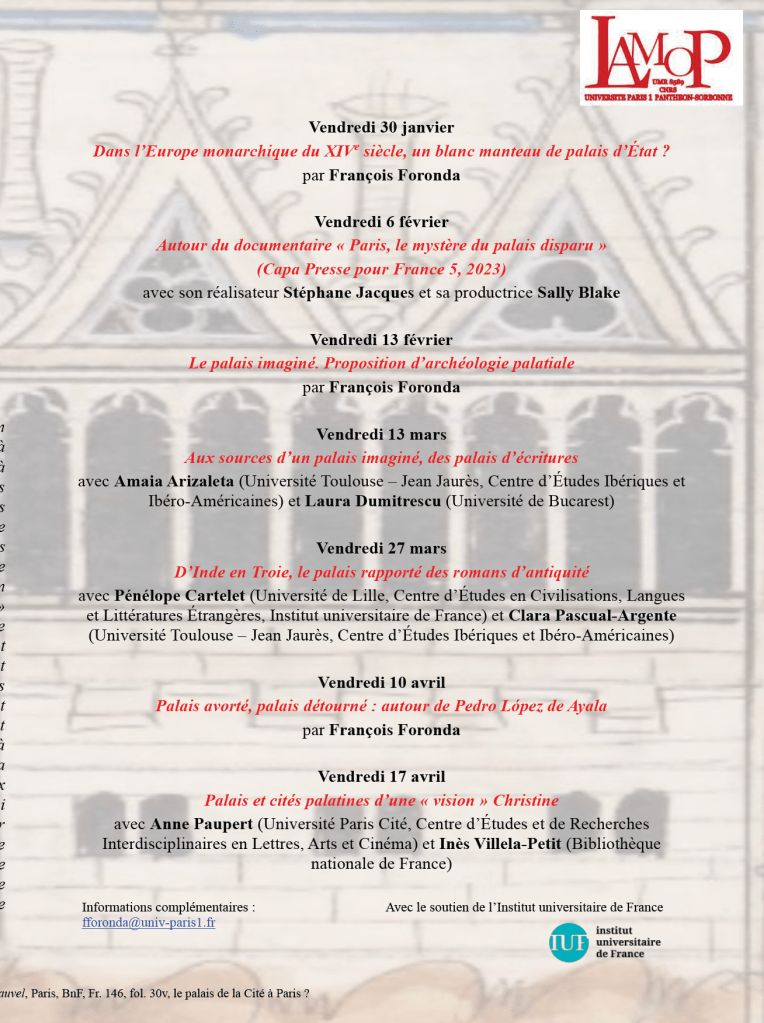 Plus tardivement que les communes italiennes, l’Europe monarchique est saisie à son tour par une fièvre architecturale au XIVe siècle : réaménagements ou constructions à neufs font surgir des « palais d’État » à Paris, à Westminster, à Avignon, à Prague, à Séville, à Barcelone, à Olite… La transformation du régime gouvernemental des monarchies européennes se donne ainsi à voir en élévation et en dispositifs : les espaces se différencient et se spécialisent, les parcours s’allongent, les usages de la salle s’enrichissent de ceux de l’appartement, voire ceux des parcs. Archéologues et historiens se sont intéressés à cette vague, toutefois sans forcément en saisir la cohérence à l’échelle européenne. Il s’agit de reprendre l’interrogation mais en déplaçant la focale en direction des sources littéraires et iconographiques. Que doit cette vague des « palais d’État » exécutés au palais imaginé ? À ce palais inventé par les romans, les songes ou même parfois la littérature doctrinale ; à ce palais supposé avoir été visité ailleurs et narrativement rapporté, notamment des terres d’« Orient », par croisés, voyageurs et chroniqueurs ; ou encore à ces palais enluminés qui ouvrent leurs portes sur ces manuscrits qu’illustrent les peintres ? Cependant, il ne s’agira pas seulement d’interroger l’imago et l’imaginaire préalables du palais. Les chantiers mêmes font actualité pour les auteurs et les peintres, ce quotidien aiguise désormais leur attention à l’égard de ces formes architecturales où s’exprime un certain rapport politique. Dans sa chronique, un Pedro López de Ayala aurait-il pu détourner les aménagements palatiaux de Pierre Ier de Castille à Séville, pour en faire le monument de la tyrannie, si le roi n’avait pas fait le choix d’une grammaire architecturale musulmane, qui pouvait laisser penser qu’il avait trahi sa communauté politique ? Christine de Pizan se serait-elle attardée dans la salle du château de Fortune si elle n’avait pas eu la connaissance intime des dispositifs palatiaux parisiens ? Et aurait-elle fait construire à ses Dames toute une cité si le Paris de sa prime jeunesse n’avait pas été le grand chantier, d’une ville royale et princière pratiquement neuve ?