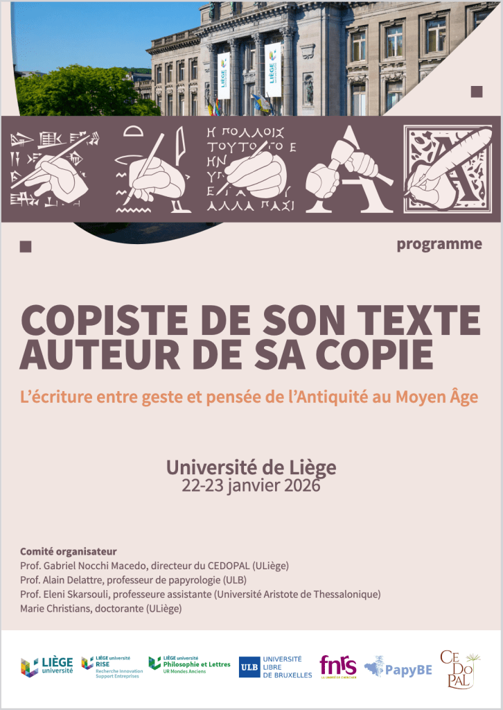 Qu’il soit tracé sur papyrus ou parchemin, gravé dans la cire ou l’argile d’une tablette, ou encore incisé dans la pierre, tout texte représente le produit d’une synthèse entre un acte intellectuel et un acte manuel. Plusieurs personnalités pouvaient s’engager activement au sein des processus de création et de transmission textuelles, en particulier les figures de l’auteur, du scribe et du copiste. Le rôle de chacun semble assez précisément défini, selon un consensus trop rarement remis en question : d’un côté, l’inspiration, les recherches et l’intention de l’auteur, et, de l’autre côté, la technique et la subordination d’un scribe ou d’un copiste, agents de l’opus seruile. Cette vision dichotomique ne peut pas rendre la réalité complexe et mouvante de la production textuelle ancienne, ni les interactions des nombreux autres acteurs qui peuvent y prendre part (secrétaire, graveur, lecteur/utilisateur/destinataire, correcteur, maître/élève, commanditaire, commentateur…), que laisse entrevoir la matérialité des sources. Ainsi, ces deux journées d’études proposent d’examiner de plus près les mécanismes de création d’un texte, particulièrement au prisme des relations qu’entretenaient les différents acteurs de l’écriture. Ces réflexions s’appuient sur des sources documentaires, littéraires et matérielles, de toute langue, que les cultures antérieures à l’imprimerie ont livrées.