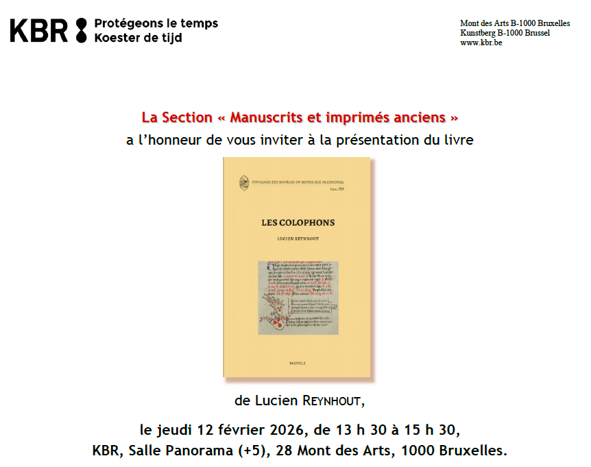 La Section « Manuscrits et imprimés anciens » a l’honneur de vous inviter à la présentation du livre Lucien Reynhout, Les colophons, Turnhout, Brepols, 2025 ; 1 vol., 253 p. (Typologie des Sources du Moyen Âge Occidental, 89). ISBN : 978-2-503-52971-4. Prix : € 65,00.