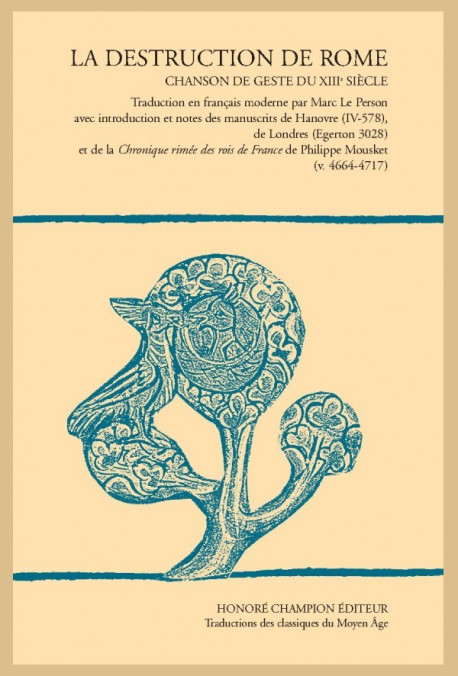 Cette traduction réunit pour la première fois les trois textes qui ont transmis le récit de La Destruction de Rome : la version longue du ms. de Hanovre (IV-578), la version courte du ms. de Londres (Egerton 3028) et le passage de la « Chronique rimée » des rois de France de Philippe Mousket, résumé d’une version plus complète perdue.