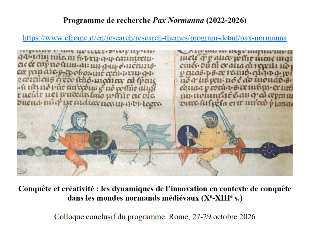 Ce colloque doit conclure le programme Pax normanna[1] (resp. Pierre Bauduin, Université de Caen-Normandie/CRAHAM, et Annick Peters-Custot, Université de Nantes/CRHIA) inscrit parmi les programmes de recherche structurants 2022-2026 de l’École française de Rome. Il fait donc suite aux précédentes rencontres scientifiques du programme : le colloque de Cerisy (octobre 2022) sur « la Pacification », les journées d’études consacrées aux « premières générations de la conquête » tenues à Oxford (octobre 2023) sur « Partir » et à Ariano Irpino (octobre 2024) sur « S’établir », enfin les journées d’études de Cosenza-San Marco Argentino (octobre 2025) sur « Gouverner la pluralité ».