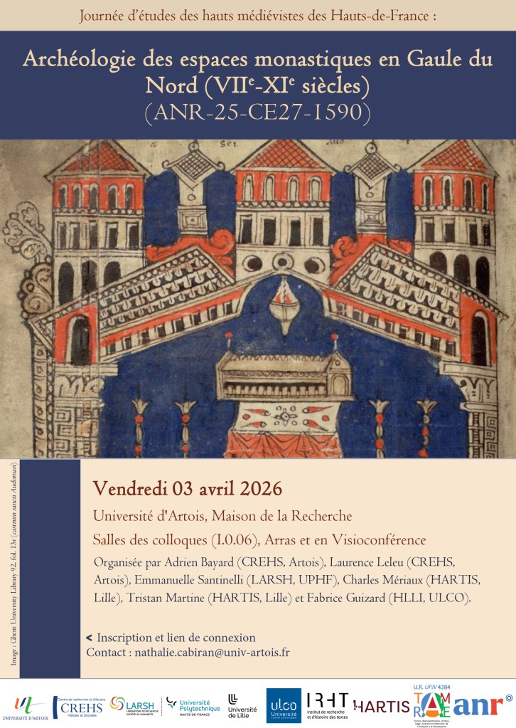 La journée d’études des hauts médiévistes des Hauts-de-France aura lieu le vendredi 3 avril 2026 à l’Université d’Artois. Elle portera sur l’archéologie des espaces monastiques en Gaule du Nord (VIIe-XIe siècles).