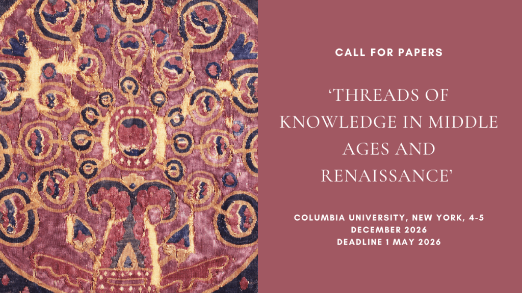 This one-day conference invites scholars from across disciplines (archaeology, art history and conservation, history, literary studies, religion, history of science, legal history) to explore how textiles, and the metaphors they inspired, shaped medieval and Renaissance life. Topics could include but are not limited to the following: production and labor; global trade and circulation; technical knowledge and transmission; gendered and domestic craft practices; liturgical and ceremonial textiles; clothing and identity; textiles as diplomatic or political gifts; conservation and material analysis; weaving and intertextuality; and the role of textiles in shaping networks and communities.