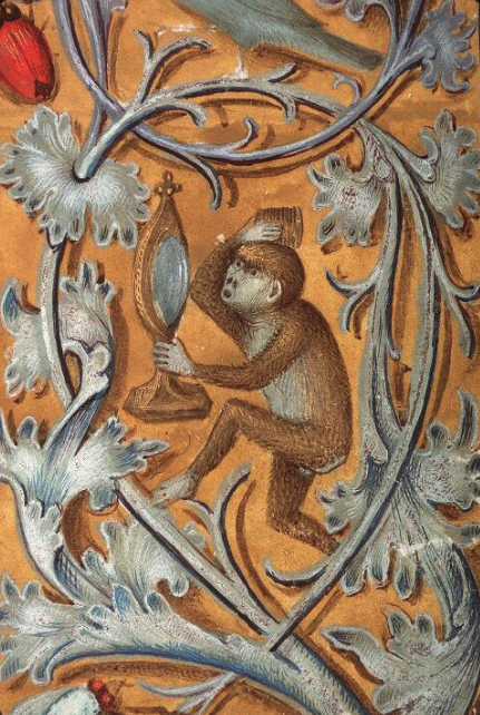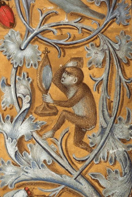 Singe se peignant devant un miroir Amiens, Bibliothèque Louis Aragon, Lescalopier 95, fol. 1.