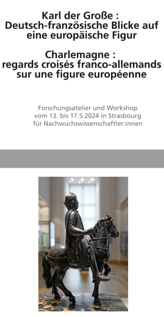Der transdisziplinäre und transnationale Work- shop, der sich zugleich als Forschungsatelier ver- steht, richtet sich an Nachwuchswissenschaftler: innen. Er zielt auf eine Tiefenanalyse der Karls- figur im heutigen, postnationalen Europa. Der Mediävistik kommt hier eine wesentliche Rolle zu, weil sie fachlich in der Lage ist, auch das prä- nationale Erbe für das Europa der Gegenwart fruchtbar zu machen und eine Epoche ‘neu’ zu denken, die vor dem jahrhundertelangen krie- gerischen Ringen insbesondere Frankreichs und Deutschlands um die Vorherrschaft stärker von kulturellem Austausch und Kontakt geprägt war. Basis unserer Arbeit sind historische und literari- sche Quellen vom 9. Jahrhundert bis heute. Me- thodisches Kernanliegen ist der ‚gekreuzte Blick‘: Deutsch-französische und lateinische Texte wer- den in interkulturell-vergleichender deutsch-fran- zösischer Perspektive beleuchtet und komparatis- tisch in Bezug auf die darin vertretenen Karlsbil- der untersucht. Dieses Vorgehen schafft, so unse- re These, ein fundierteres Verständnis der Genese und Transformation nationaler Stereotype und auch nachnationaler Errungenschaften wie der deutsch-französischen Freundschaft und der europäischen Einigung. So wird ein durchaus eta- bliertes Thema aufgrund signifikanter Quellen (Texte, Bilder) zu Karl mit gegenwartsrelevanten Fragen ganz neu perspektiviert.